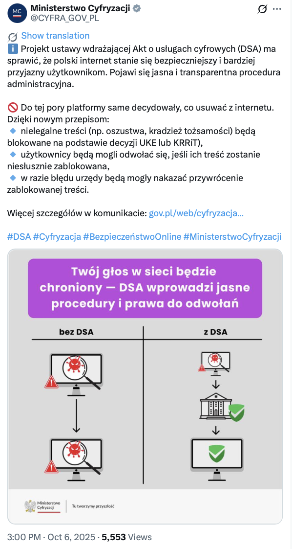Unijny akt o usługach cyfrowych (Digital Services Act, DSA) od miesięcy stanowi temat debaty publicznej w Polsce. 23 września Rada Ministrów przyjęła projekt ustawy wdrażającej DSA. W mediach społecznościowych pojawiają się ostrzeżenia przed rządową cenzurą ukrytą „pod pozorem walki z nielegalnymi treściami i dezinformacją”. Niektórzy politycy opozycji przestrzegają, że ustawa jest „atakiem na wolność słowa”. W rzeczywistości DSA jest regulacją mającą zwiększyć odpowiedzialność platform internetowych za nielegalne treści. Projekt ustawy wdrażającej DSA w żaden sposób nie zmienia granic wolności słowa. Dotyczy wyłącznie wąskiej listy treści, stanowiących konkretne przestępstwa opisane w Kodeksie karnym. Nowe przepisy zabraniają cenzury prewencyjnej i ogólnego monitorowania treści przed publikacją, koncentrując się wyłącznie na usuwaniu już opublikowanych materiałów, których zamieszczanie już teraz jest niezgodne z polskim prawem.